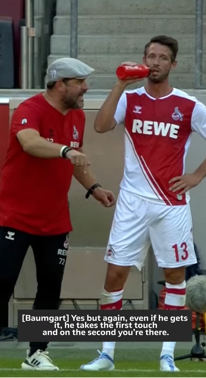 The players’ microphones captured the pre-match team talk among the Cologne players, along with Cologne coach Steffen Baumgart issuing some pitch-side instructions to player Mark Uth during the game (pictured, right).
