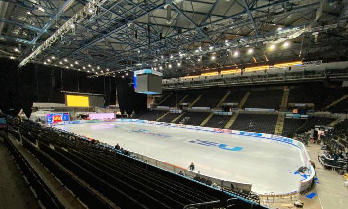 Speaking to SVG Europe, Mark Dennis, Sunset+Vine technical producer for the event, says: “The Sheffield Arena is where they film Gladiators – not on ice! – and on ice it’s also the home of the Sheffield Steelers [ice hockey team]. It obviously does host bigger skating events as well, but I guess as we all know, once you put the word European Championships and broadcast onto a venue, size instantly becomes an issue because of our slightly larger footprint and everything that needs to go into the venue, and the number of athletes involved. The venue team have been excellent, British ice skating have been excellent, but we are trying to fit a lot into the venue.