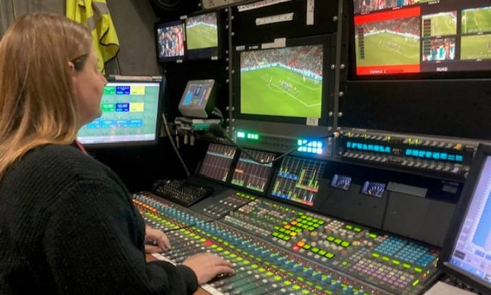 Sky Sports sound team leader Rachel Oliver working on a Premier League Production