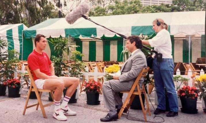 At the tennis earlier on in her career, Rachel Oliver holding the boom for an interview