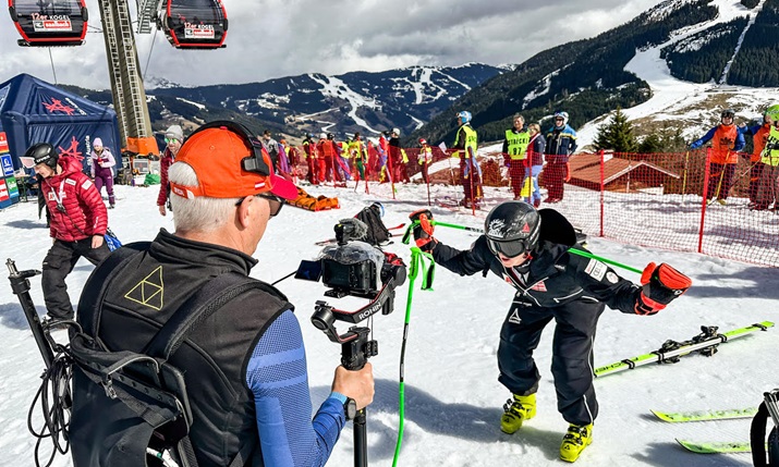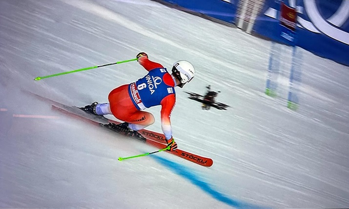 And, to convey the speed and undulations of the course, two drones are in use: one FPV (first person view) to ‘chase’ skiiers as the move down the mountain, and another regular drone for beauty shots, with both provided via Theis Media.